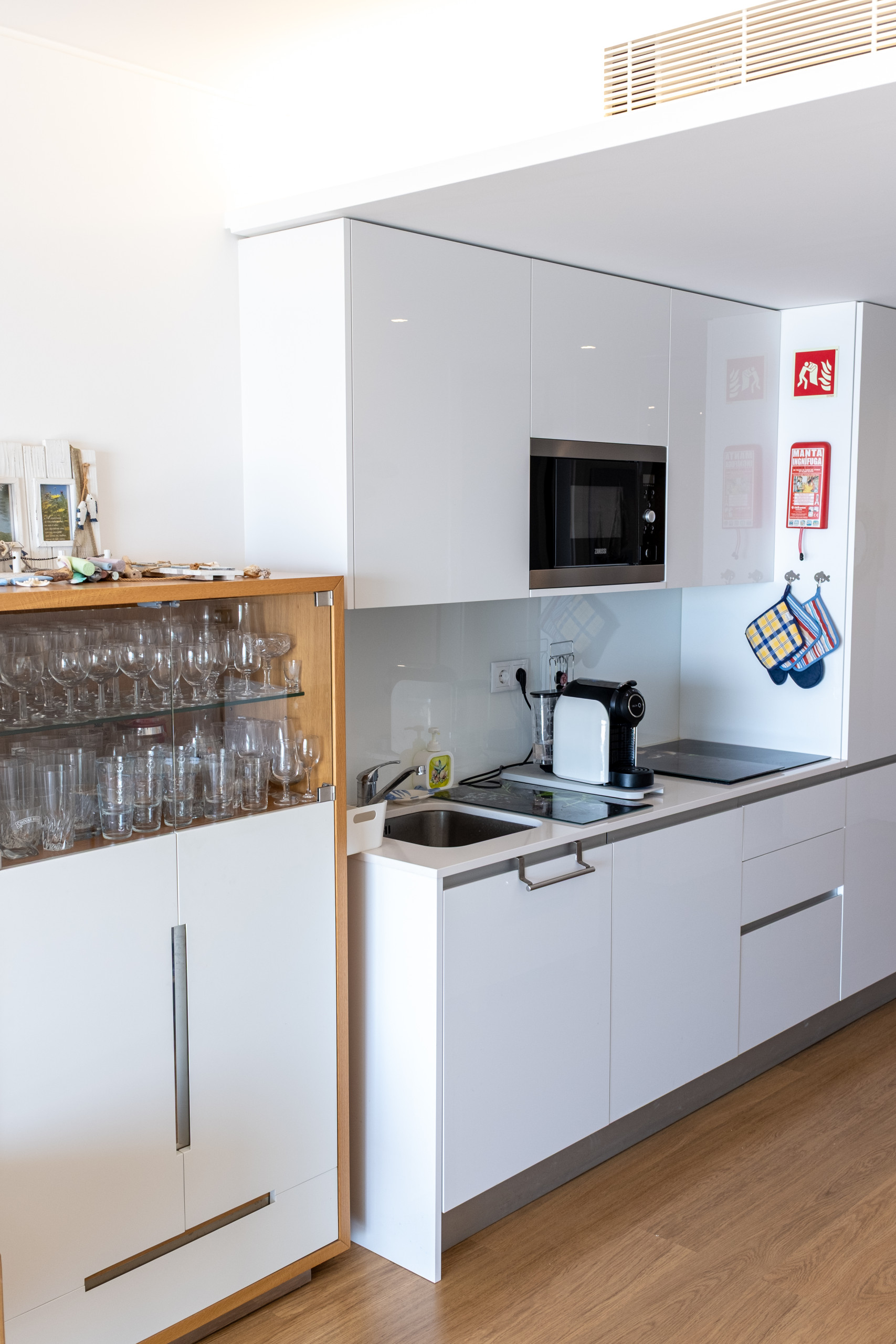 La cuisine américaine, à induction, est équipée avec réfrigérateur, micro-ondes, four, congélateur, lave-vaisselle, vaisselle/couverts, ustensiles/cuisine, cafetière, friteuse, grille pain, bouilloire et presse-agrumes.