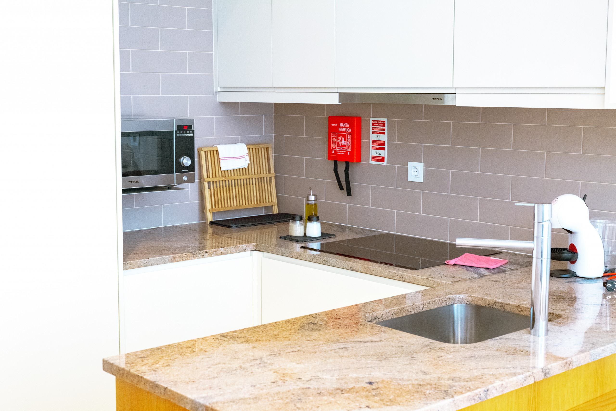 La cuisine américaine, à induction, est équipée avec réfrigérateur, micro-ondes, congélateur, vaisselle/couverts, ustensiles/cuisine, cafetière, grille pain, bouilloire et equipement de cuisine.